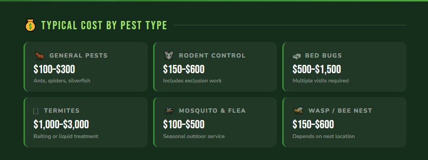 | Bed bug treatment | $500 – $1,500 | Usually requires 2–3 visits minimum |