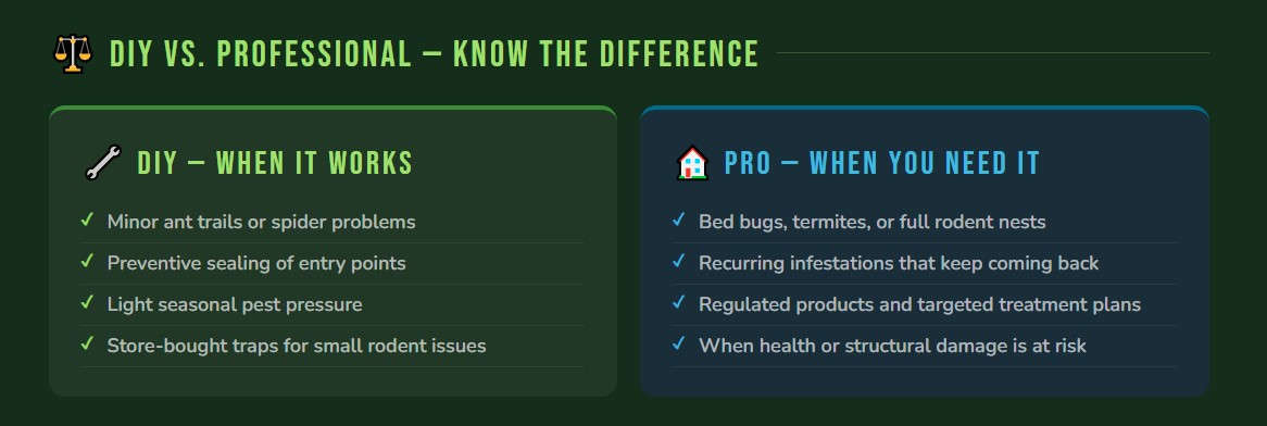 For very minor issues — a few ants near a windowsill, the occasional spider — store-bought products can work fine as a short-term fix. But they don’t address the source of the problem, and for anything involving bed bugs, termites, rodents, or a widespread infestation, over-the-counter products almost never solve it. We see a lot of calls from homeowners who spent months trying to handle things themselves and ended up with a bigger, more expensive problem.