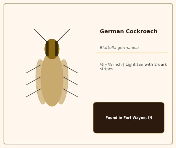 The German cockroach is the #1 most problematic roach species in Indiana — and across the country. Adults are small, typically half an inch to just under an inch in length, with a tan or light brown color. The telltale sign? Two dark parallel stripes running behind their head.