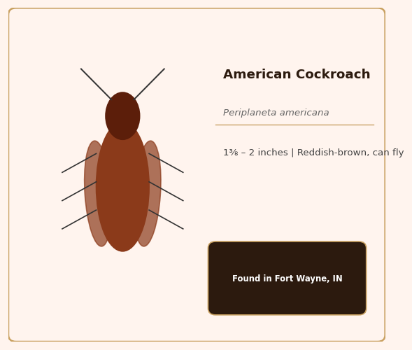 The American cockroach is the largest roach species commonly found in Fort Wayne structures, ranging from 1.5 to 2 inches long. These are the reddish-brown roaches with a distinctive light-colored marking on the plate just behind their head. Unlike the German cockroach, American cockroaches can fly.