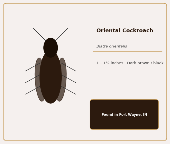 The German Cockroach is by far the most common species found inside Fort Wayne homes and businesses. It is small (half to five-eighths of an inch), light tan with two dark stripes behind its head, and reproduces extremely rapidly. A single female can generate hundreds of offspring in her lifetime, which is why German cockroach infestations can explode in a matter of weeks. They are most often found in kitchens and bathrooms, particularly under and behind warm appliances like refrigerators, dishwashers, and ovens.