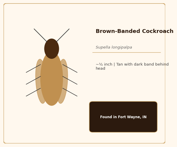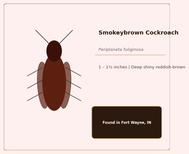 Less common in Indiana but occasionally seen, the Smokeybrown cockroach is a large, uniformly dark reddish-brown species about 1 to 1.5 inches in length. It’s primarily a Southern U.S. pest that may arrive in Fort Wayne via shipped goods or produce. It can be distinguished from the American cockroach by its single solid color (the American has a two-toned pattern).