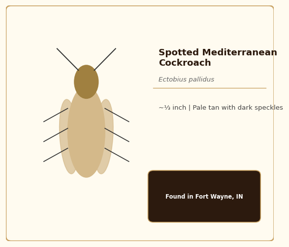 This is a very small roach — barely a third of an inch — with a pale tan body covered in small dark speckles. Originally from Europe, this species has expanded its range dramatically and is now found throughout Indiana. It primarily lives outdoors on vegetation and is unlikely to establish an infestation inside your home. However, like many outdoor roaches, it’s drawn to lights at night and may fly inside through open doors or windows.