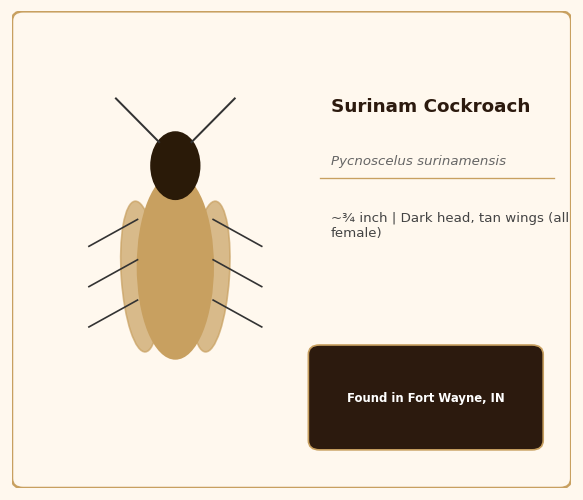An unusual species in more ways than one: the Surinam cockroach is about three-quarters of an inch long, dark at the head, and tan-winged. Remarkably, the species consists entirely of females that reproduce without mating. They’re rarely encountered in the Fort Wayne area except inside greenhouses and atriums with heavy plant life. If you spot them outdoors in colder months, they almost certainly came from somewhere warm.